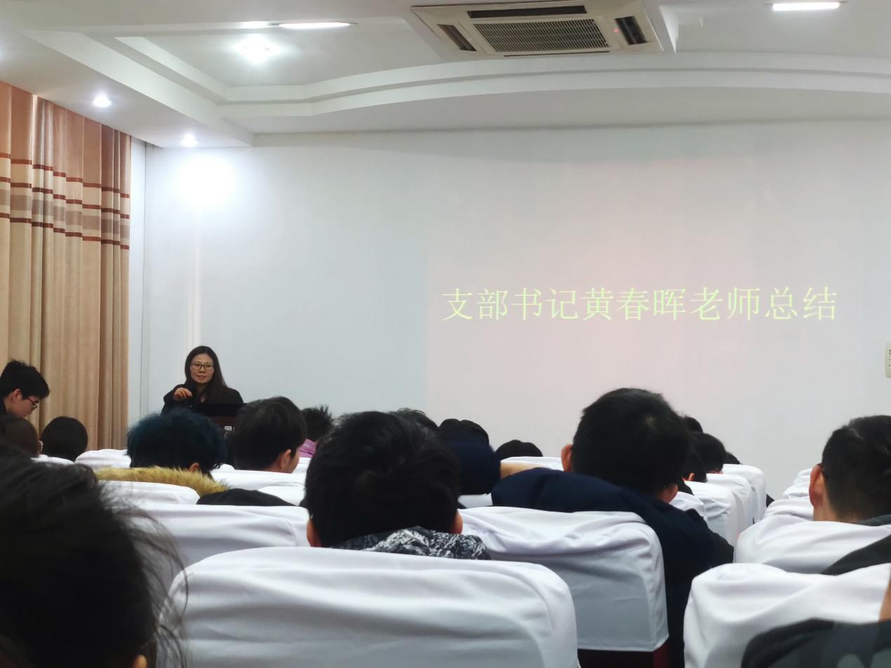 会议最后,支部书记黄春晖老师做总结发言。她首先对通过本次发展大会顺利成为中共预备党员的12名同志表示热烈祝贺,同时也对他们提出了几点要求:1、加强理论学习,关注时事政治,坚持理论联系实际,深入研究,学用结合;2、按时参加支部的会议和活动,为支部建设和发展献言献策;3、积极参加各种实践活动,用自己所学的知识尽自己所能为社会服务,为人民服务。最后,黄春晖老师提到,成为一名党员,是新的起点,希望所有党员都能时刻准备着,为共产主义事业奋斗终身,坚持不忘初心跟党走,在今后的学习工作中,按照党员的标准严格要求自己,争取成为一名优秀的共产党员。