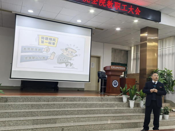 刘稳丰结合典型案例与政策要求,深入剖析开展师德师风建设的重要性与实践路径。他指出,师德师风是教师的立身之本,具有涵盖面广、渗透性强的特点,其要求超越一般职业道德,教师需以“学为人师、行为世范”为准则,在教育教学、学术研究、社会交往中严格自律。并结合教育部通报案例与高校实际,重点阐述分析了言论出格、违规收受钱物、学术不端、师生关系失当等四类违反师德师风的表现。他强调,师德失范后果严重,不仅影响个人事业发展与家庭幸福,还将损害啪啪啦