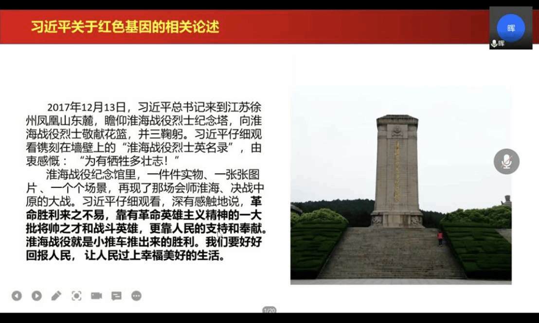 黄春晖老师从中国共产党精神谱系的主要内容,习近平关于红色基因的相关论述,学习精神谱系、传承红色基因三个方面讲述了主题内容。黄春晖老师首先详细介绍了中国共产党人精神谱系的主要内容,讲解了典型精神的核心和内涵。然后带大家梳理了习近平总书记关于红色基因的重要论述:党的十八大以来,从河北西柏坡到山东临沂,从福建古田到陕西照金,从江西井冈山到贵州遵义……习近平总书记在红色足迹中汲取治国理政的智慧和营养,思考中国共产党的使命与担当,将红色基因的传承上升到治国理政的新高度。