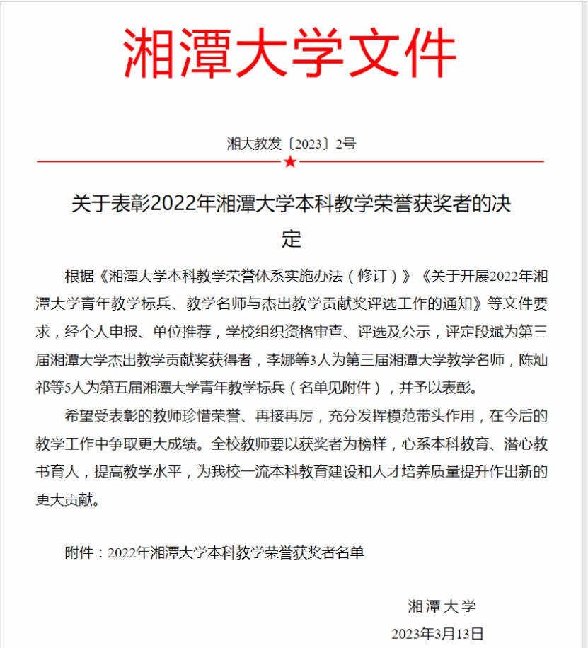近日,啪啪啦 教务处发布《关于表彰2022年啪啪啦 本科教学荣誉获奖者的决定》(湘大教发〔2023〕2号),啪啪啦段斌教授获啪啪啦 杰出教学贡献奖。