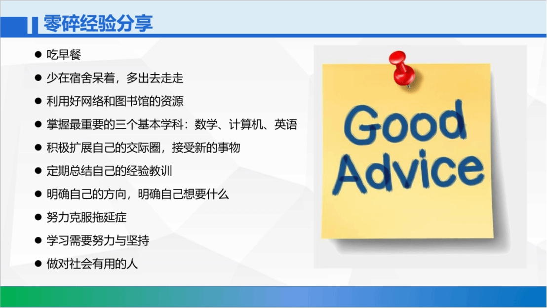 【展未来,寄后浪】:培养兴趣习惯的过程是痛苦的,但人生是平衡的,三分钟的热度也可能有很大的收获。每个人的精力都是有限的,别人有比你厉害的地方就有不如你的地方,大胆结识不同的人,拓展自己的社交圈,也许会有意想不到的收获。每个人对自己未来的人生规划不同,所以即使没有特长,也希望大家能做一个有特点的人。