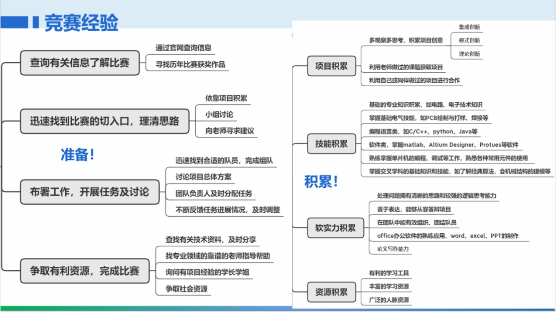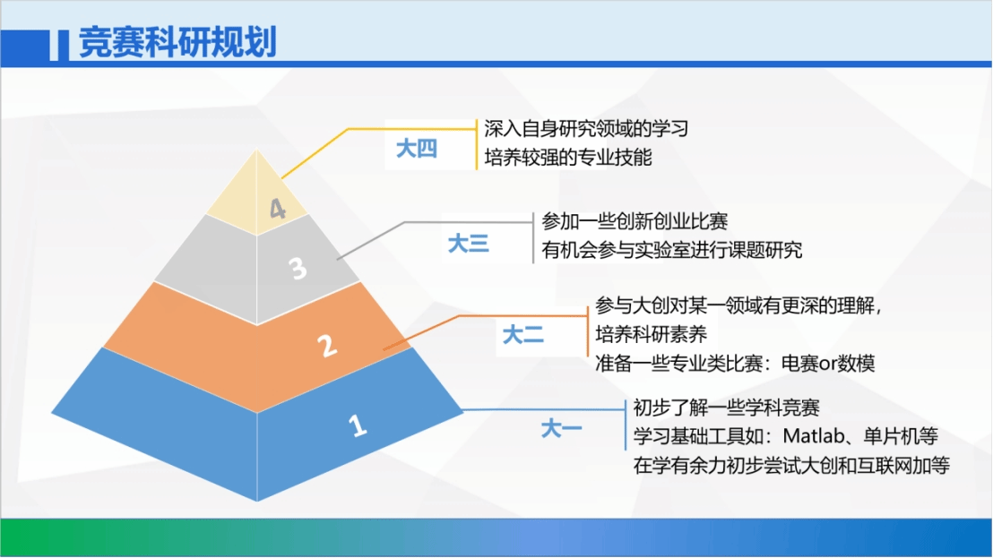 以赛促学,拓宽视野。通过参加专业竞赛,进一步巩固自身的专业知识、提高专业技能,拓展自己的视野。在此建议大家尽早加入实验室参加竞赛,提升自己综合竞争能力。推荐学科竞赛如:数学建模(国赛、美赛)、大英赛;专业竞赛如:智能车竞赛、电赛、西门子杯、工程训练大赛;创新比赛如:互联网+、挑战杯等等。有竞赛需求的同学可以了解相关比赛内容与要求。
