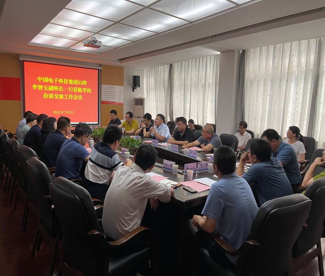 2021年7月5日上午9点在学校办公楼304会议室,中国电子科技集团22所李智玉副所长一行来我校洽谈交流,副校长葛飞带领科技处费俊杰处长、国家应用数学中心副主任黄牛武、陈玉莹副处长、数啪啪啦 副院长袁海专,以及自动化与电子信息啪啪啦 院长姚志强带领院党政领导出席了本次会议,还有柳文教授、彭拯教授,自电院部分教师也参加了本次会议。