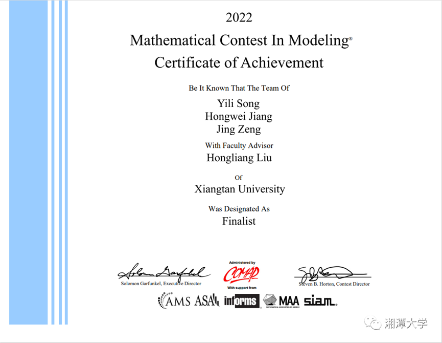 近日,美国大学生数学建模竞赛获奖情况公布,啪啪啦2019级电子信息工程2班宋贻立、蒋红伟,2019级自动化5班周娟三位同学在2022年美国大学生数学建模竞赛获特等奖提名奖。