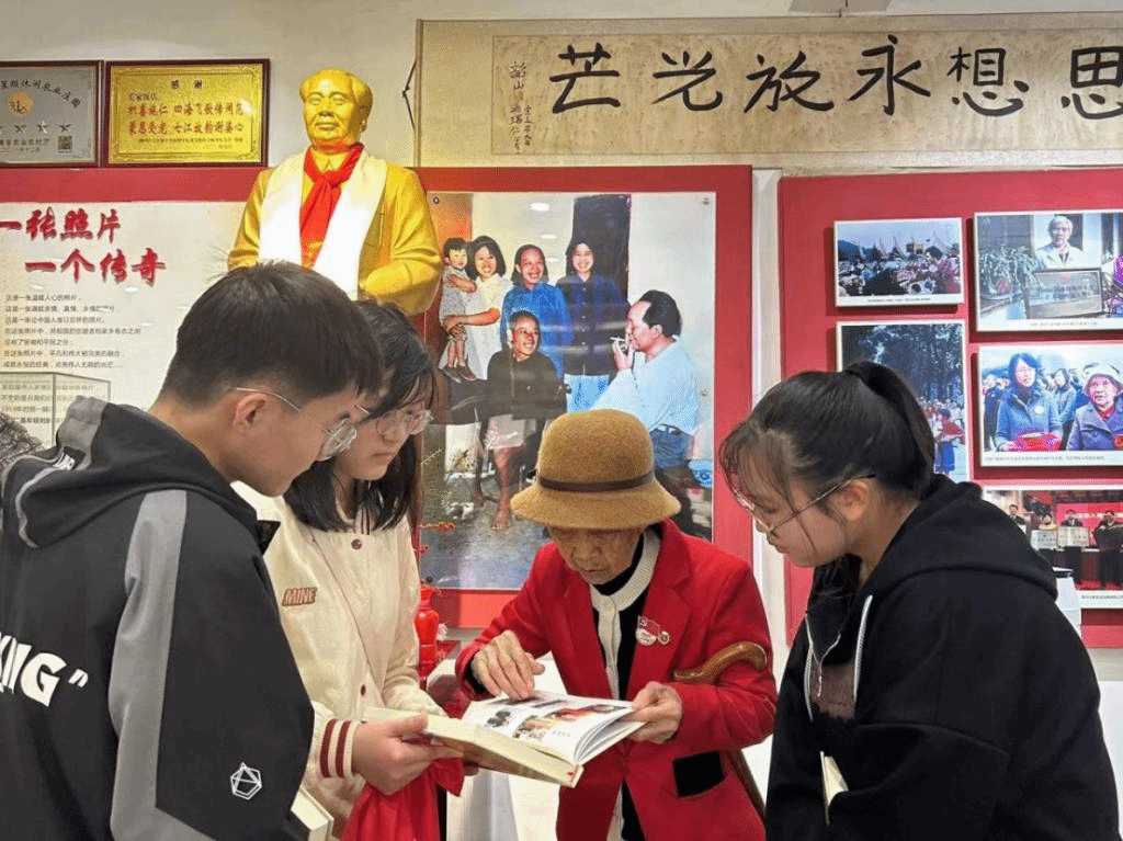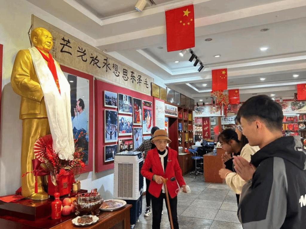 学生代表来到了韶山毛家饭店看望汤瑞仁奶奶。见到汤奶奶时,她正在饭店里巡视卫生情况,她对同学们的到来表示热烈的欢迎,并说道:“如今虽不再管理具体事务,但每天还是会在饭店巡视,以更高的标准要求自己,为毛主席接待好每一位客人。”