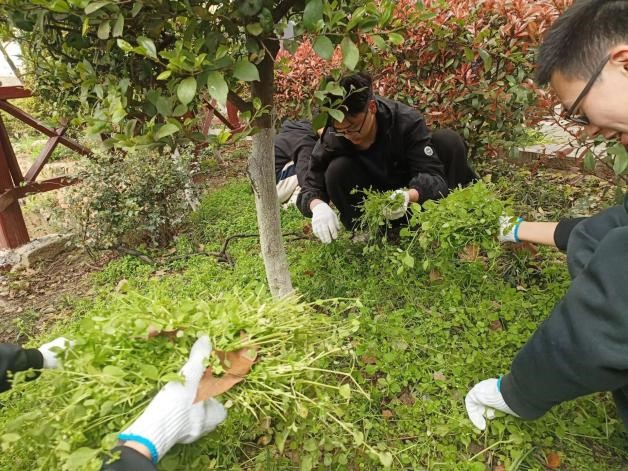 水池边,小路上,每一位同学都在积极贡献自己的力量,每一个草堆都是志愿者们劳动的结晶。在这个风和日丽的下午,手套上的墨绿色是最美的颜色,有美景相配,歌舞相伴,同学们深刻感受到了人与自然和谐共生。微风拂面,清风徐来,令人神往。他们脸上的笑容多么灿烂,既是友谊的体现,也是雷锋精神的传承。