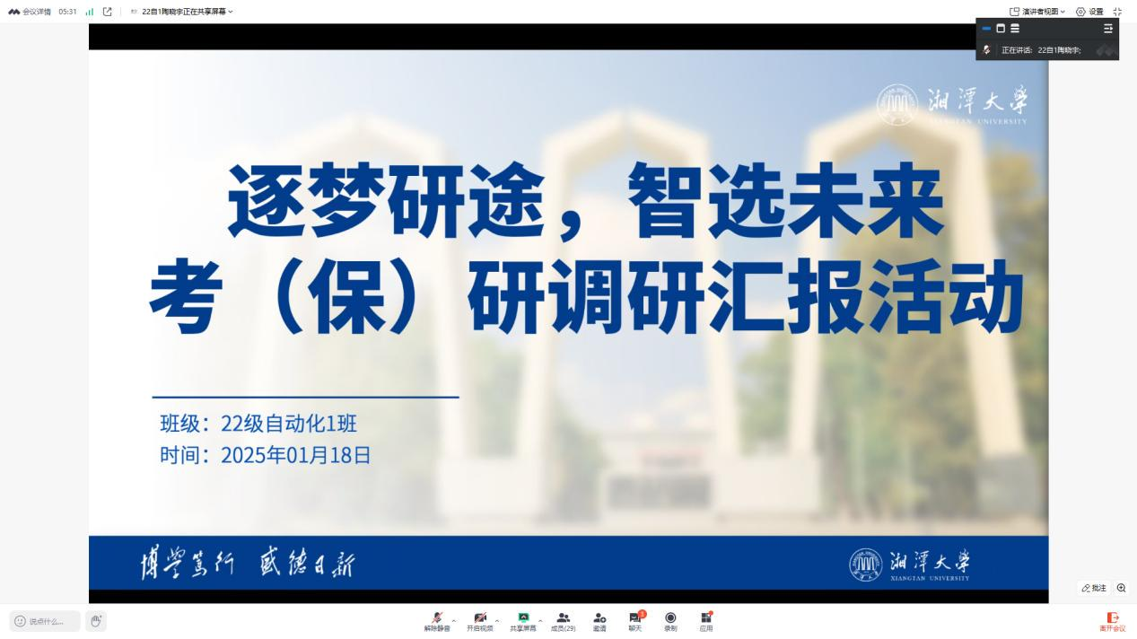 校展开深入调研,并精心制作PPT。2025年1月18日晚,各小组代表在线上进行了精彩的汇报。汇报内容涵盖了考研保研形势调研和目标院校调研两大方面,包括考试内容与科目、学硕与专硕的区别、报考条件与流程、政策变化趋势,以及目标院校的优势学科、录取标准与要求等。