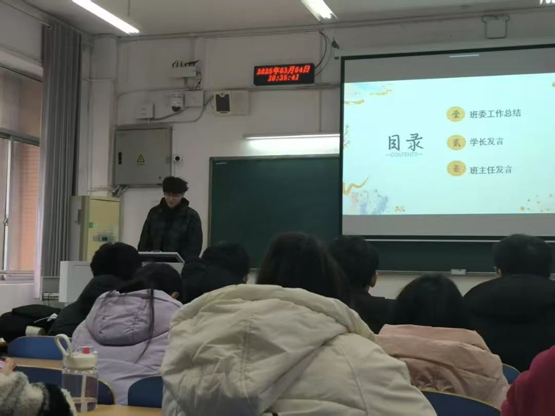 班会伊始,班委成员依次登台汇报工作。班长陆劲夫从学习、竞赛、班风建设、奖助学金及新学期规划等方面展开全面总结,建议学业待提升或尚未明确规划的同学树立信心、科学规划。