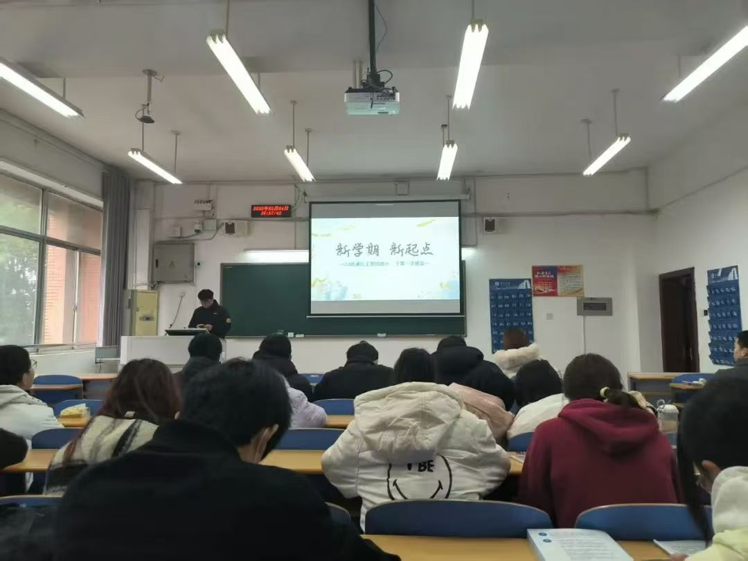 兴湘教学楼C206教室,2023级通信工程4班召开新学期主题班会,班主任蒋昱梅老师与全体同学共同参会。