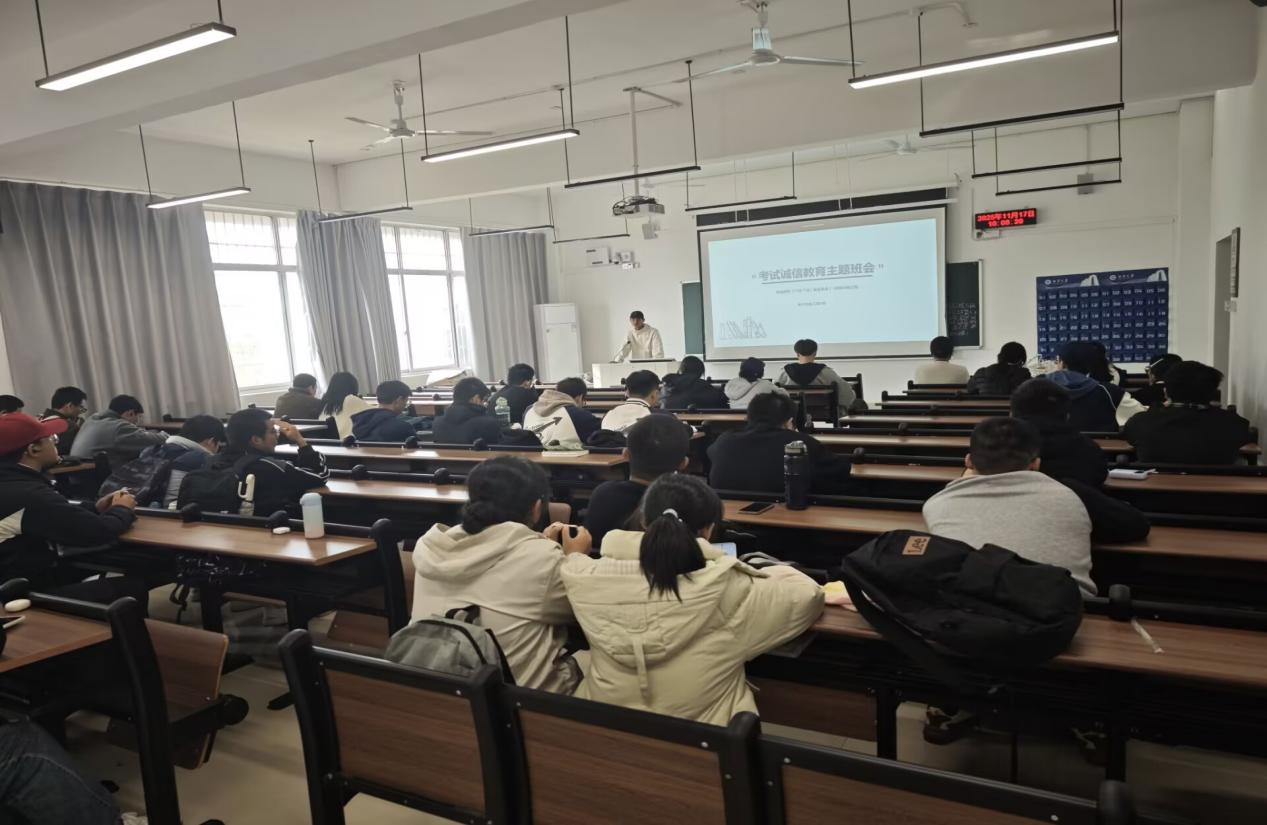 25级电子信息工程五班在兴湘A305教室召开期末与四级备考动员大会。班长、学业辅导员及班主任出席会议,为同学们提供备考指导与暖心鼓励。