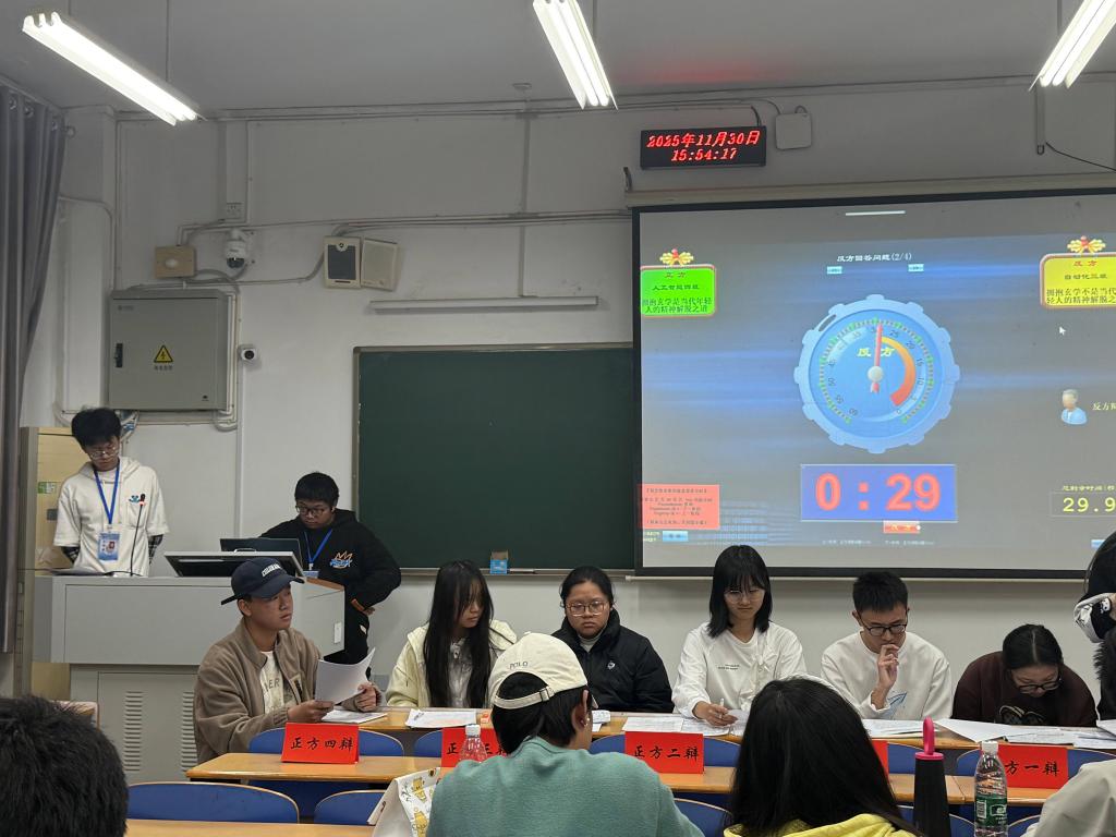 本届院辩论赛吸引了学院内各班级的众多同学参与。25级人工智能四班代表队作为一支充满活力的队伍,在初赛、复赛和半决赛中表现亮眼。他们先后围绕“赋魅/祛魅更容易使人获得幸福”、“温饱是否是人谈论道德的必要条件”和“拥抱玄学是否是当代年轻人的精神解脱之道”等辩题与对手展开多轮精彩交锋。