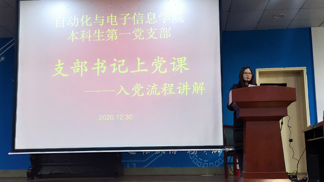 (通讯员 欧阳嘉琪)2020年12月30日上午,支部书记黄春晖老师在工科楼阶梯教室为本科生第一党支部全体党员上党课,党课主题是《入党流程讲解》。