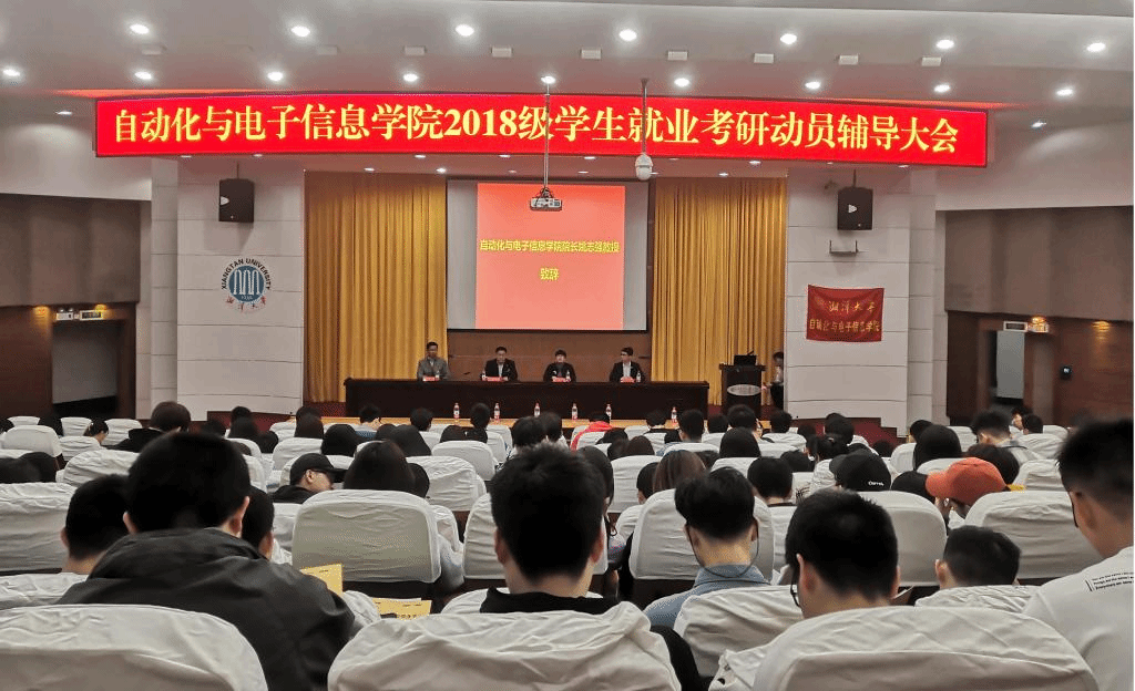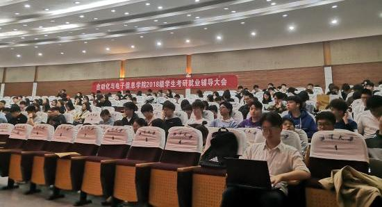 在逸夫楼一报告厅举行2018级学生就业考研动员辅导大会,以帮助同学们尽早树立明确的就业考研目标,了解形势,掌握政策。学校招生与就业指导处赵婵处长、自动化与电子信息啪啪啦