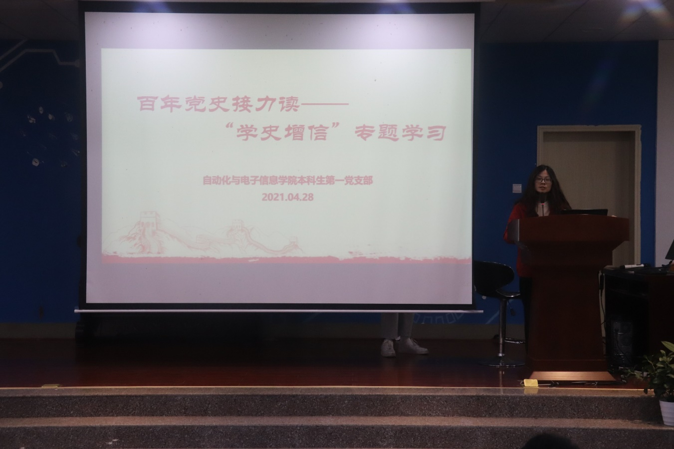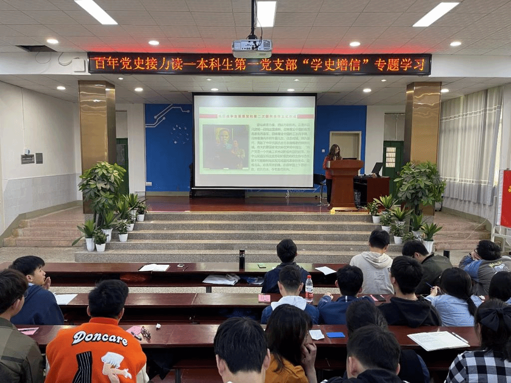 本科生第一党支部在工科楼阶梯教室开展了百年党史接力读——“学史增信”专题学习。
