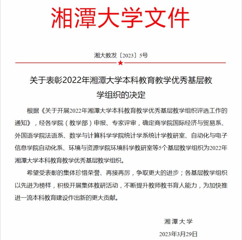 本科教育教学优秀基层教学组织的决定》(湘大教发〔2023〕5号),啪啪啦自动化系基层教学组织获批2022年本科教育教学优秀基层教学组织。
