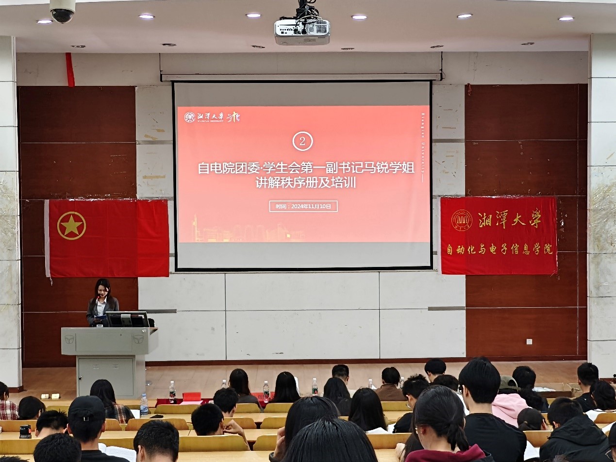 会议第二项:自电院团委·学生会第一副书记马锐学姐讲解秩序册及培训。马锐学姐详细地介绍了比赛的具体流程以及注意事项,为下周的比赛的顺利进行作出了有利保障。
