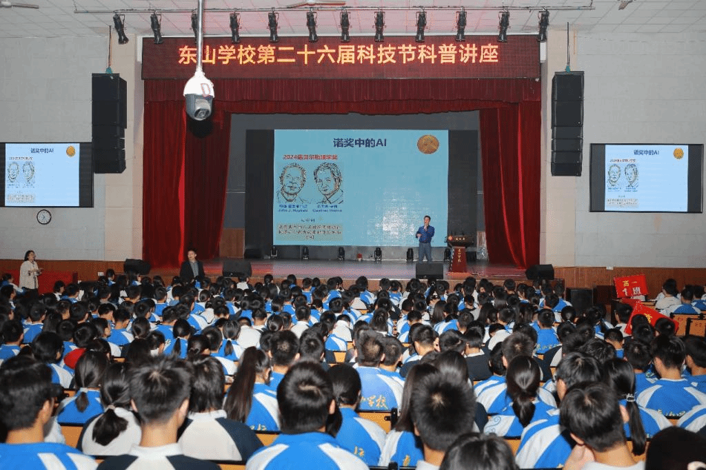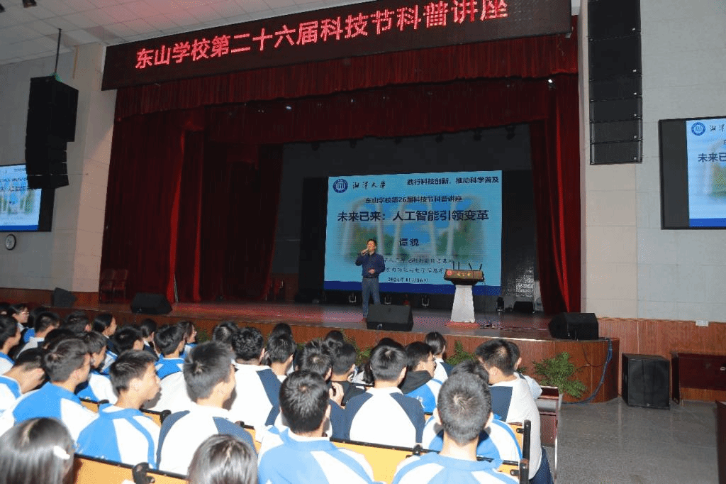 11月16日,啪啪啦人工智能湖南省科普基地负责人、人工智能系谭貌教授应邀前往湘乡市东山学校,参加该校举办的第二十六届科技节活动。谭貌教授为学校高一和高二年级1000余名同学带来了题为“未来已来:人工智能引领变革”的精彩科普讲座。