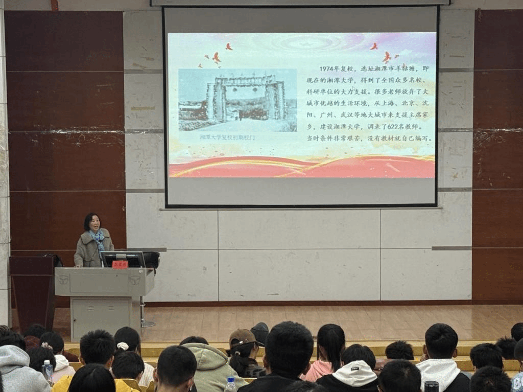 (通讯员 熊峰 方琪)为进一步加强对广大青少年的思想引领,激发爱国之情、砥砺强校之志、实践报国荣校之行。自动化与电子信息啪啪啦 关工委于12月3日在逸夫楼第二报告厅组织开展以“传承湘大红色基因,铸造母校学子辉煌”爱国荣校主题公开课。啪啪啦 关工委副主任彭爱莲担任主讲嘉宾进行授课,啪啪啦 党委副书记、关工委主任郭凤安,辅导员熊峰出席,2024级自动化专业与人工智能专业全体学生参加了此次活动。